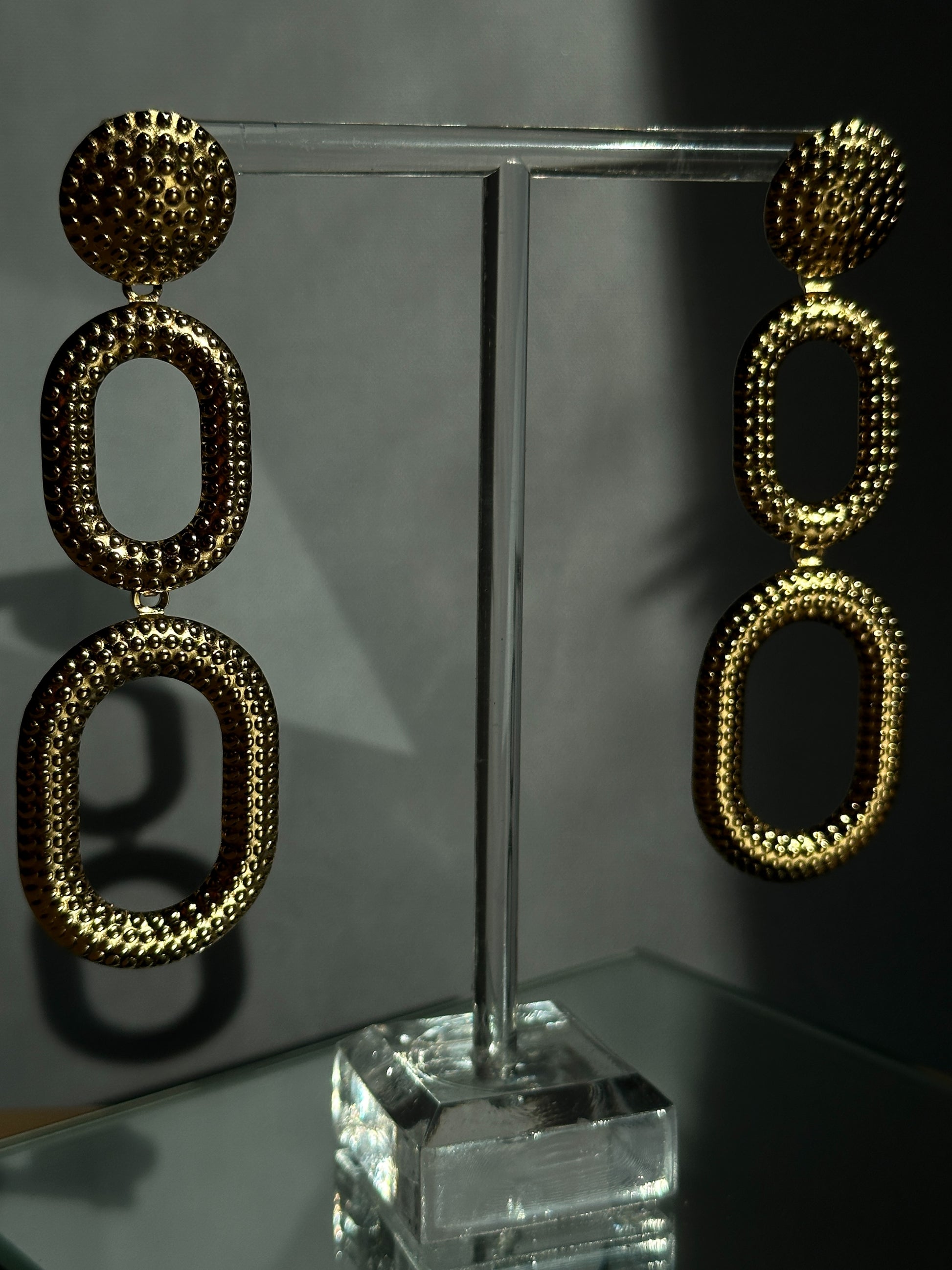 These beautiful CIRA Earrings are skillfully crafted with 18k gold plated stainless steel, featuring three textured circles for added depth and style. Enjoy a luxurious look and feel without breaking the bank.