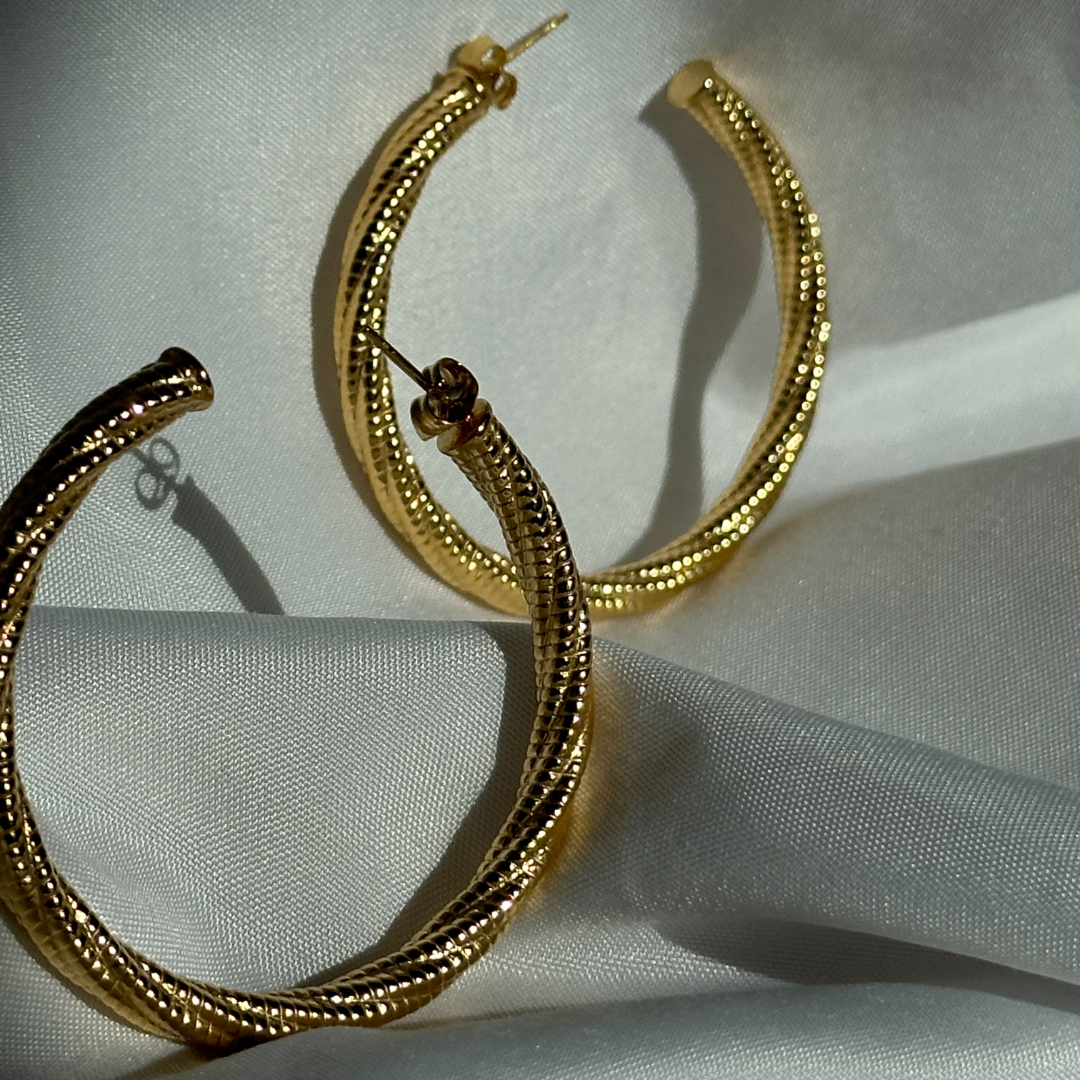The classic hoop earrings get a modern twist with the CLIO Earrings. Featuring a twisted texture design, these earrings come in 18K gold plated and silver options, giving you the perfect accessory for your look.